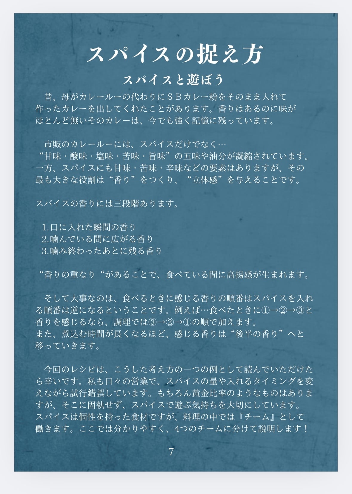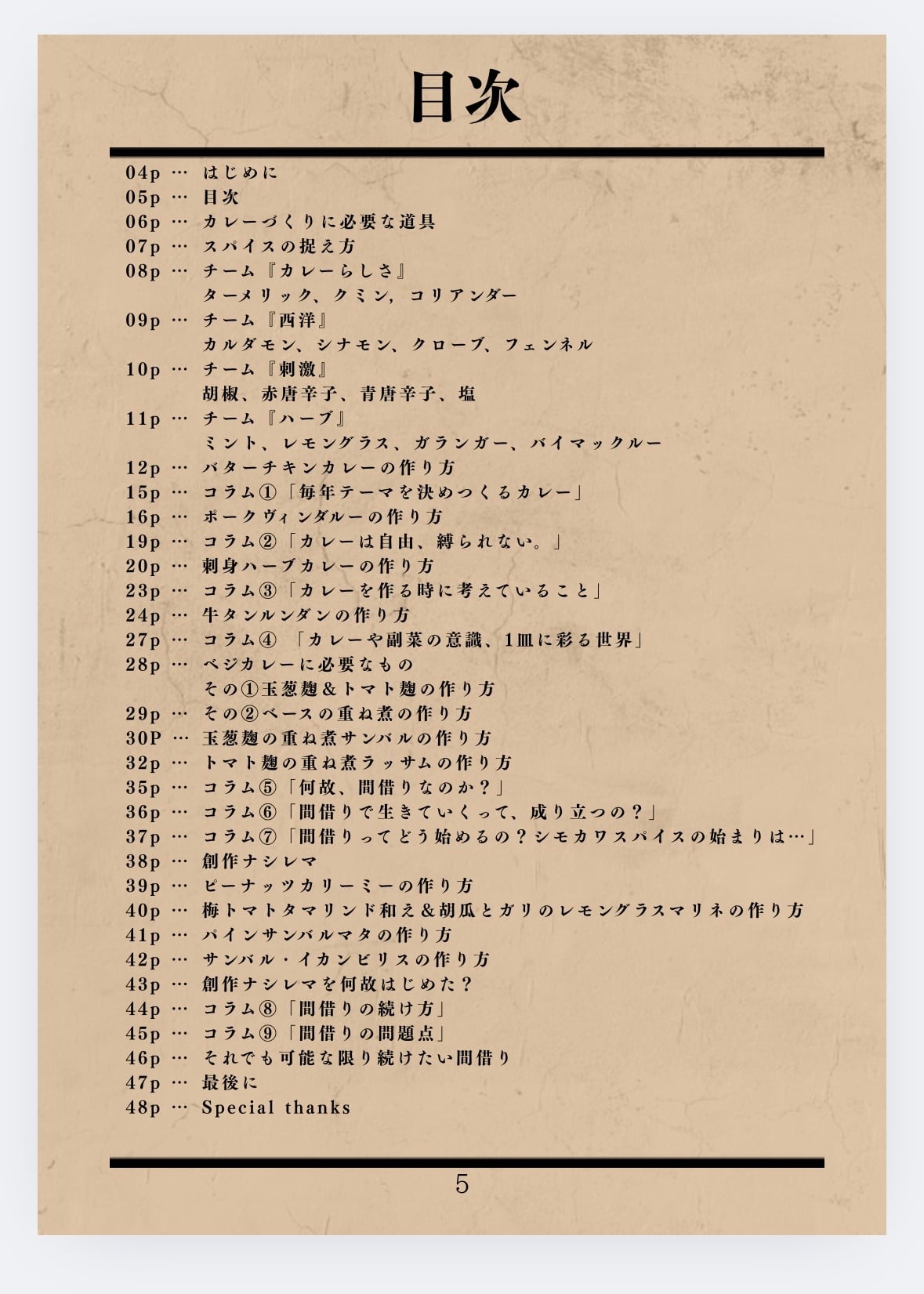 5年間、間借りカレー屋をしてきて1年ごとに追求してきたカレーレシピと、考え方について書かせていただいた約50ページの同人誌です